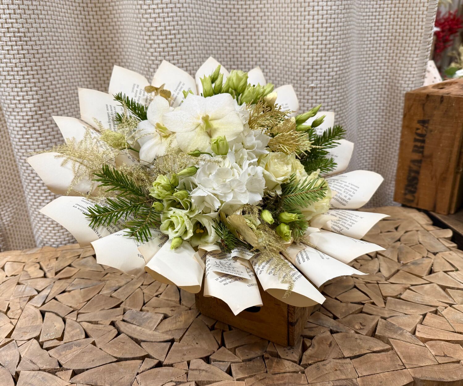 Un bouquet atypique à base de récupe, composé de fleurs blanches champêtres .