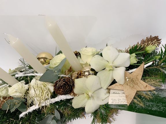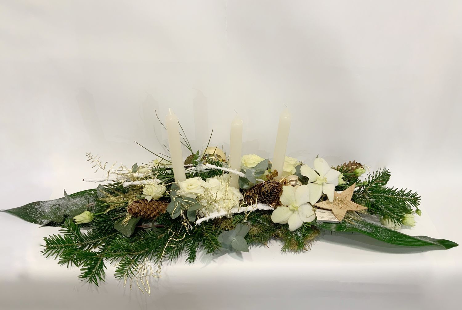 Chemin de table noëlisé blanc/vert /or, vanda,hortensia,roses blanches, bougies...pour un air de fête.