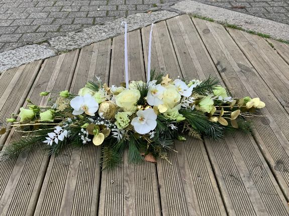 Long Chemin de table noëlisé , blanc/vert /or, orchide ,hortensia,roses blanches, bougies...pour un air de fête.