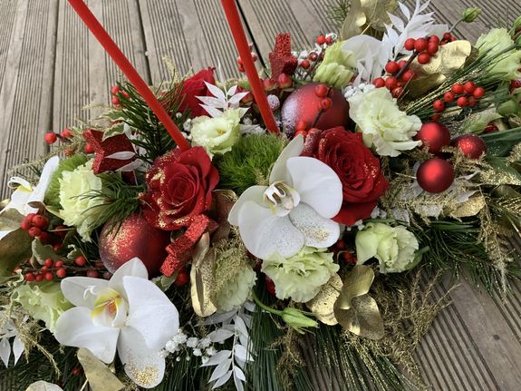 Chemin de table noëlisé blanc/vert /or, orchide, hortensia,roses blanches, bougies...pour un air de fête.