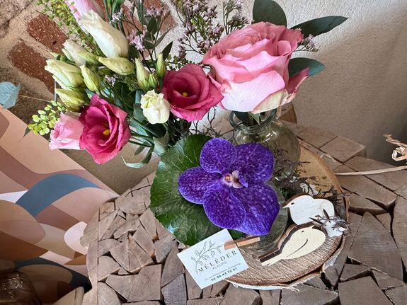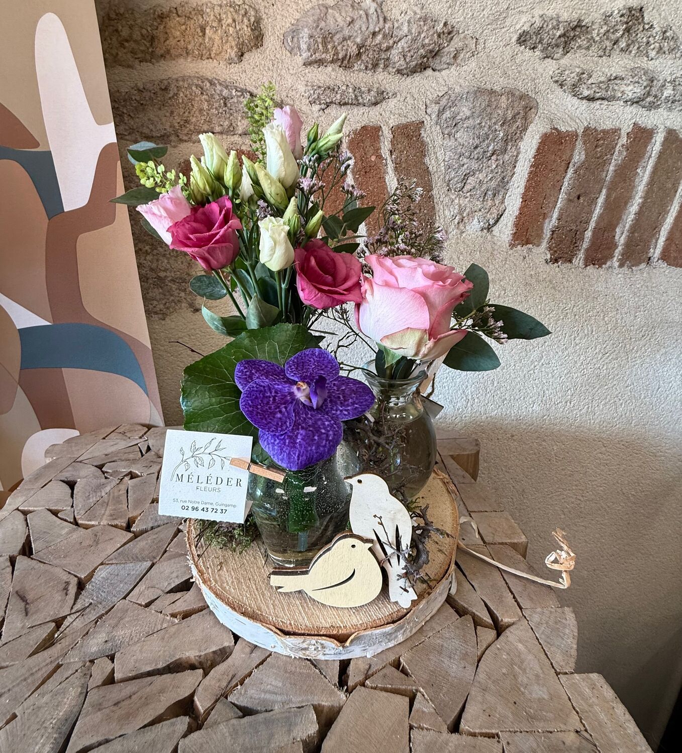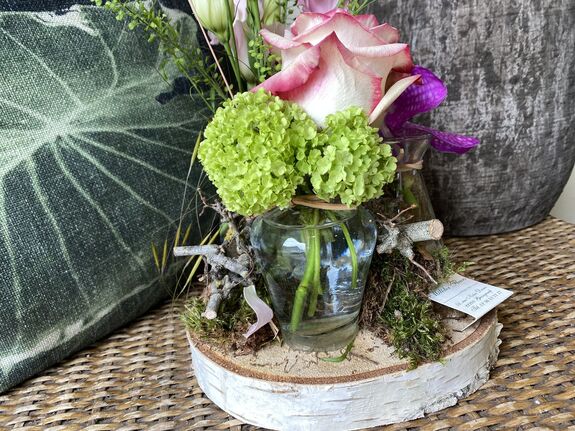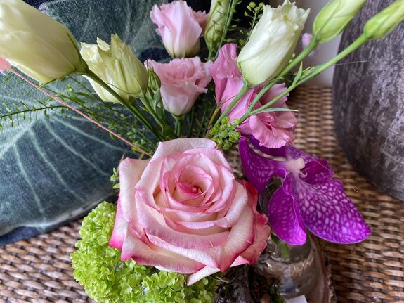 Création florale de vase sur rondin. Couleur pastel rose.Esprit champêtre.