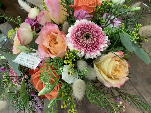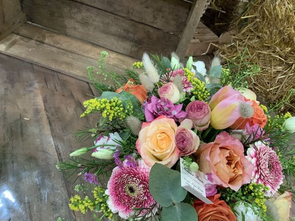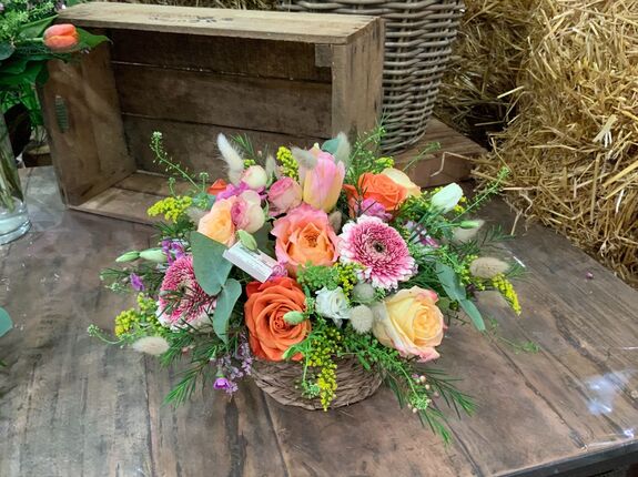 Un dynamique mélange de fleurs colorées, eucaly, rose, pitthos, wax, amaranthe...en vannerie ou panier.